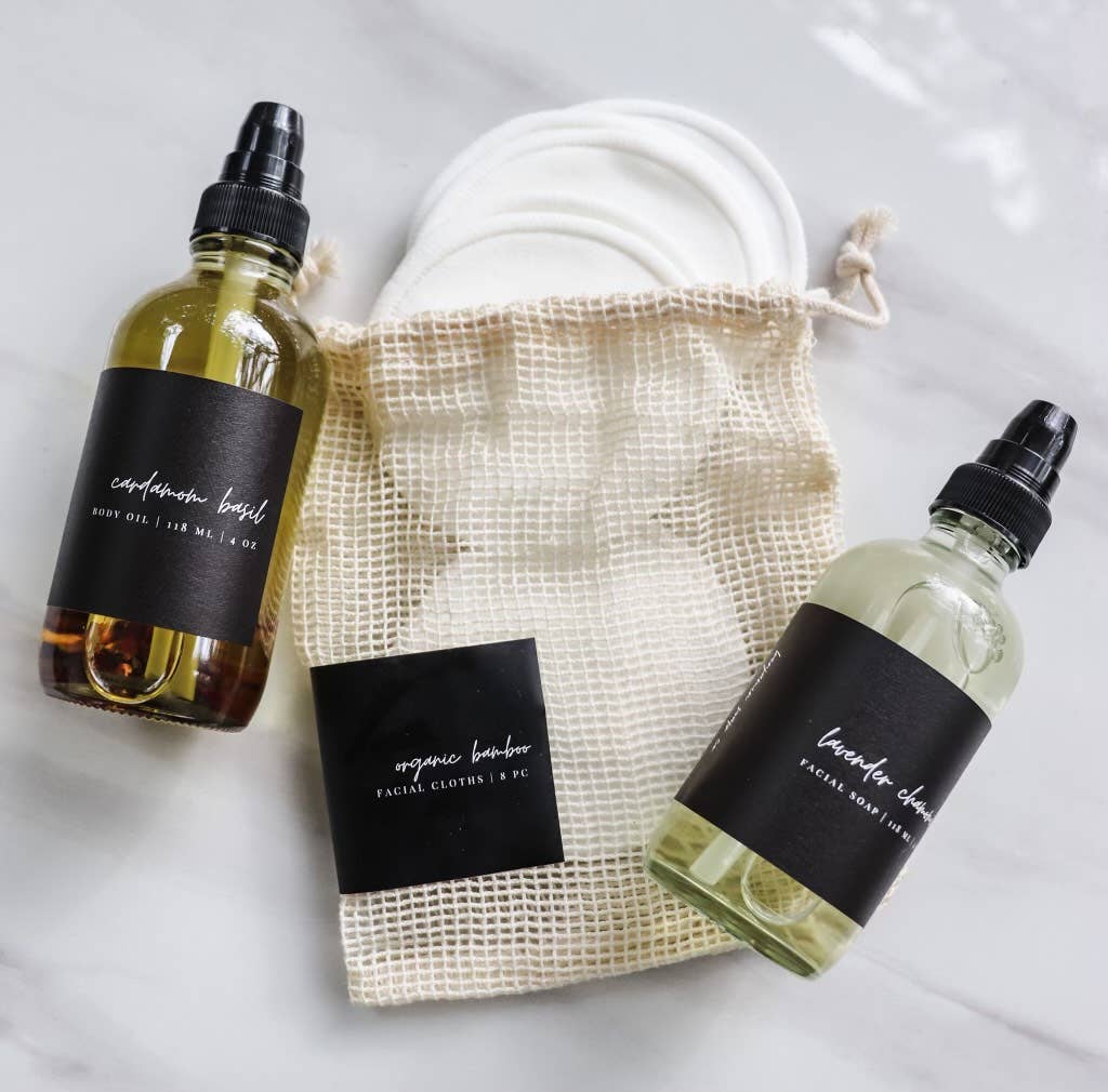 Handmade in Oregon from 100% organic bamboo cotton, our new facial cloths are machine washable & hypo-allergenic and packaged in an organic cotton mesh bag.
