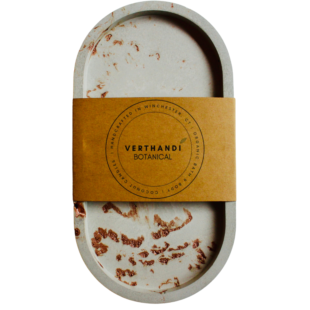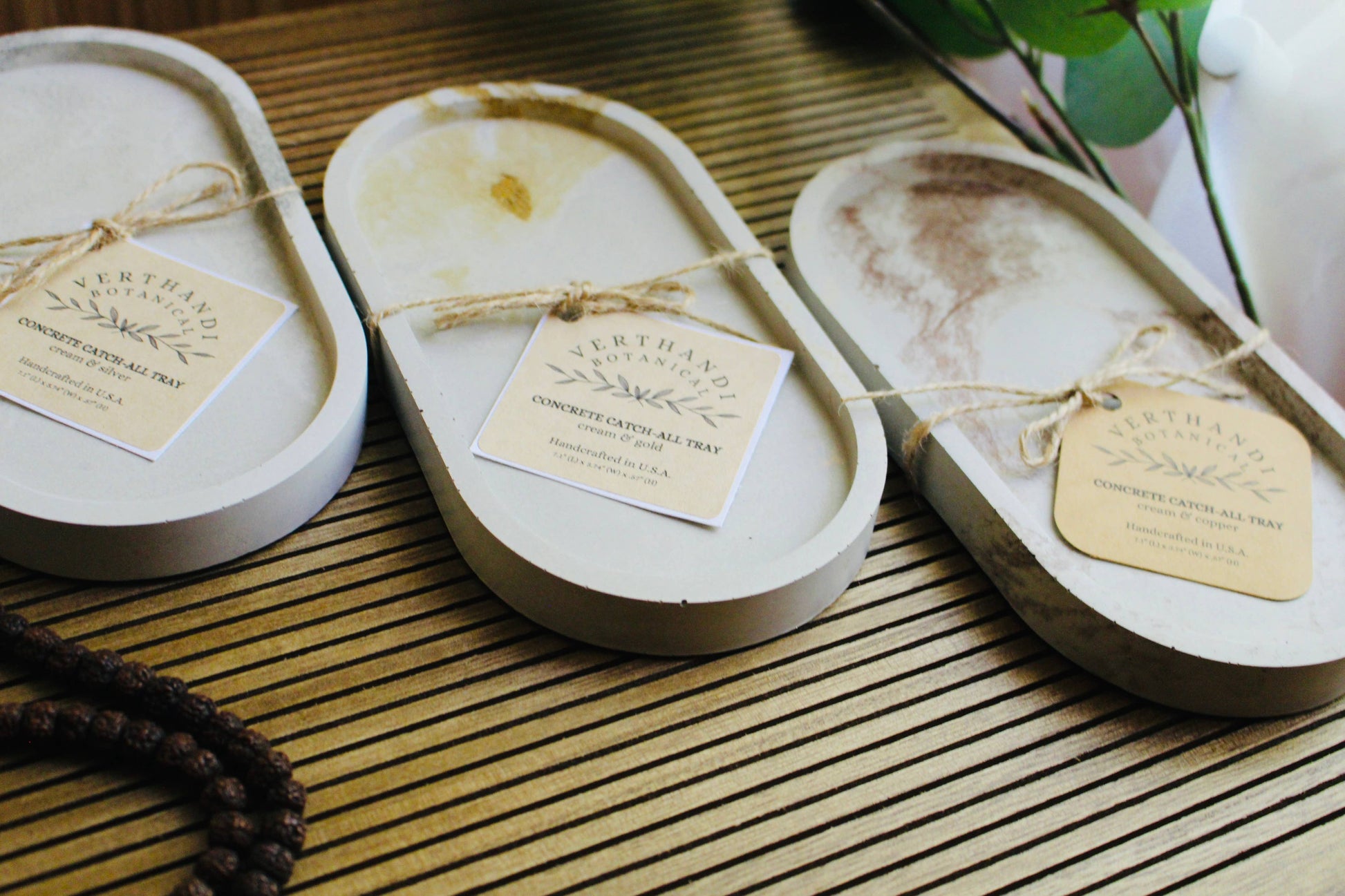 These handcrafted concrete trays can be used for really anything! Each tray has cork bumpers on the bottom to help protect the surface on which it is placed.