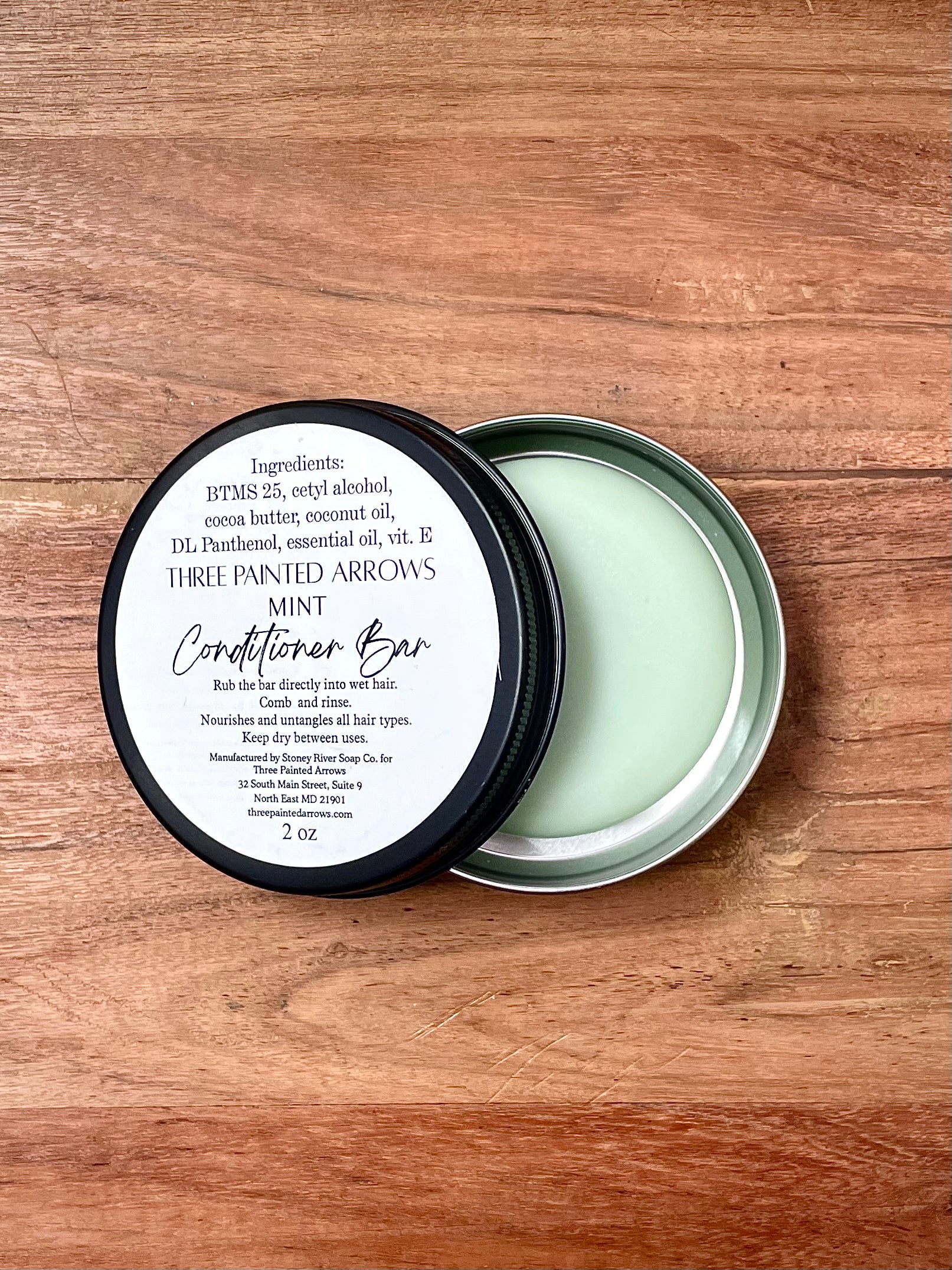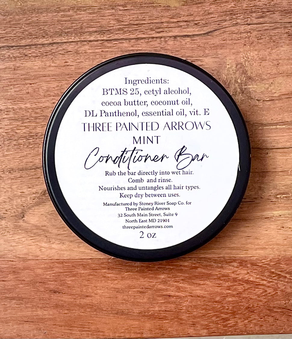 The conditioner bars are 2 oz. They work great and last a long time. So convenient when traveling! Just rub the bar directly on the hair, especially in the ends, comb your hair, leave it on for a minute, then rinse. You may also reapply a tiny bit after you are done rinsing and leave it on. Important to keep it dry between uses. Ingredients: BTMS 25 (derived from colza oil), cetyl alcohol, cocoa butter, coconut oil, dl panthenol, vitamin E, scented with either essential oils of lavender, mint, lemon or fragrance oil of coconut, or unscented.