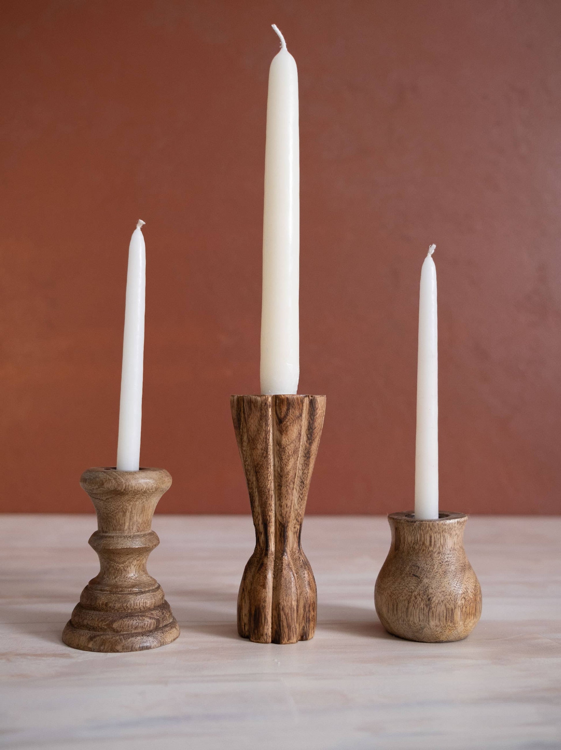 Enjoy having the option of "skinny" and "standard" sized taper candle holders at a flip. These were exclusively made to match our EVOKE candle line. Have fun playing with heights and candle colors! Hand-dipped candles will fit in these holders. Due to the process of being hand dipped, taper candles can very by the eighth inch and may need to be "chiseled" at base to fit tightly or if too skinny, may need a drop of wax added to the base to stand straight. • Solid Wood • Natural Finish • Two Sided Candle Holders to fit two sizes of candles •