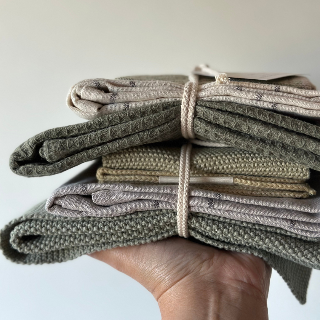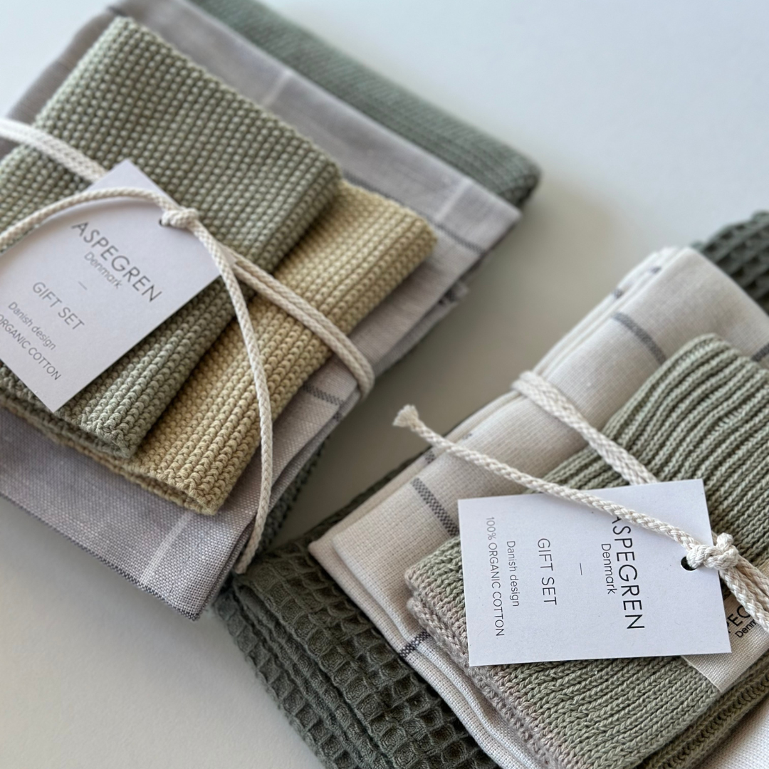 A fresh gift set featuring one tea towel, one kitchen towle and tow dish cloths. Ideal for various occasions, this set is not only long-lasting but also presented with care and designed to be sustainable.