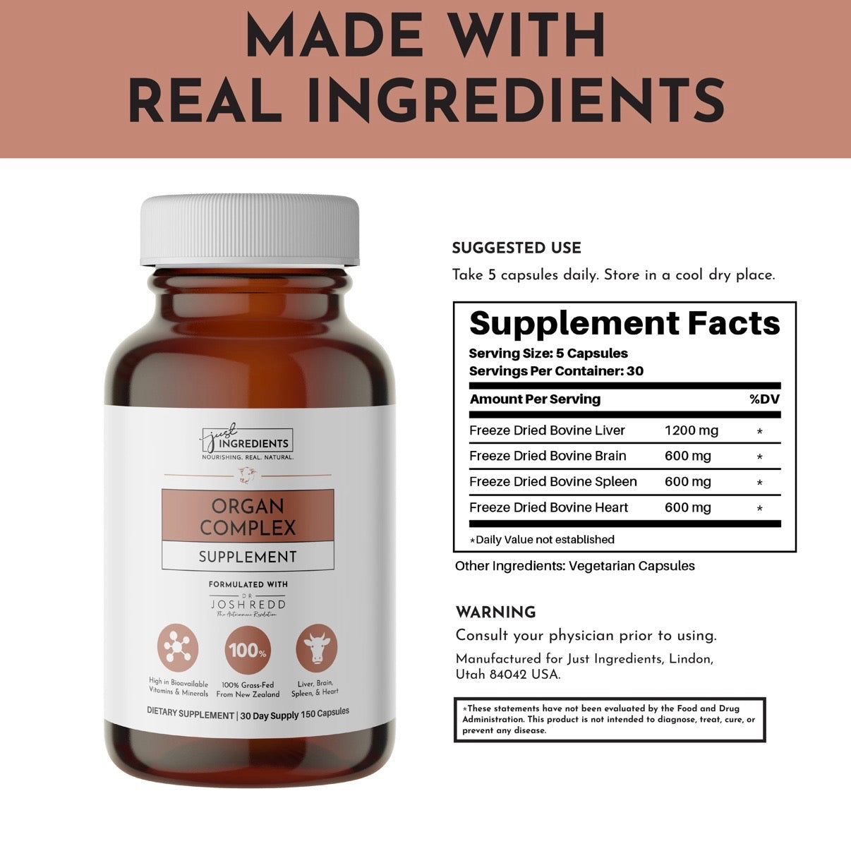 Just Ingredients Organ Complex is a nutrient-dense alternative to traditional multivitamins, thoughtfully formulated to support energy, mood, and overall vitality.* It features four real food ingredients—liver to support energy and brain function, brain to nourish cognitive health, spleen to support immunity and digestion, and heart to promote cardiovascular wellness.* Sourced from grass-fed cows raised in New Zealand under strict farming standards, this formula delivers highly bioavailable nutrients to support better absorption.*