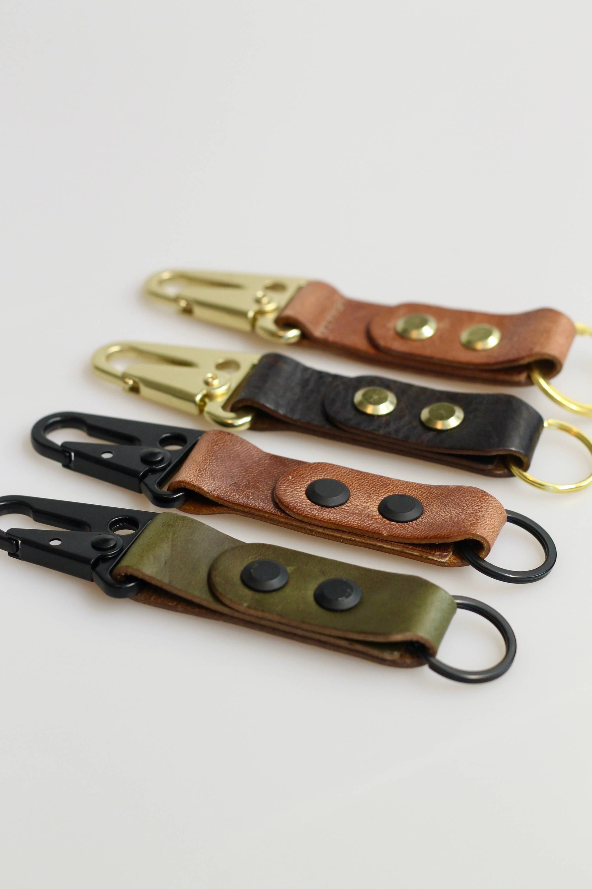 The Leather Keychain is such an elegant way to put a stop to over-filled pockets in dress pants and jackets. This keychain features finished edges, locking screws and spring locking clip. The subtle features of blacked out powder coated hardware and rivets and full grain leather make the perfect gift. Made by hand in the heart of America.