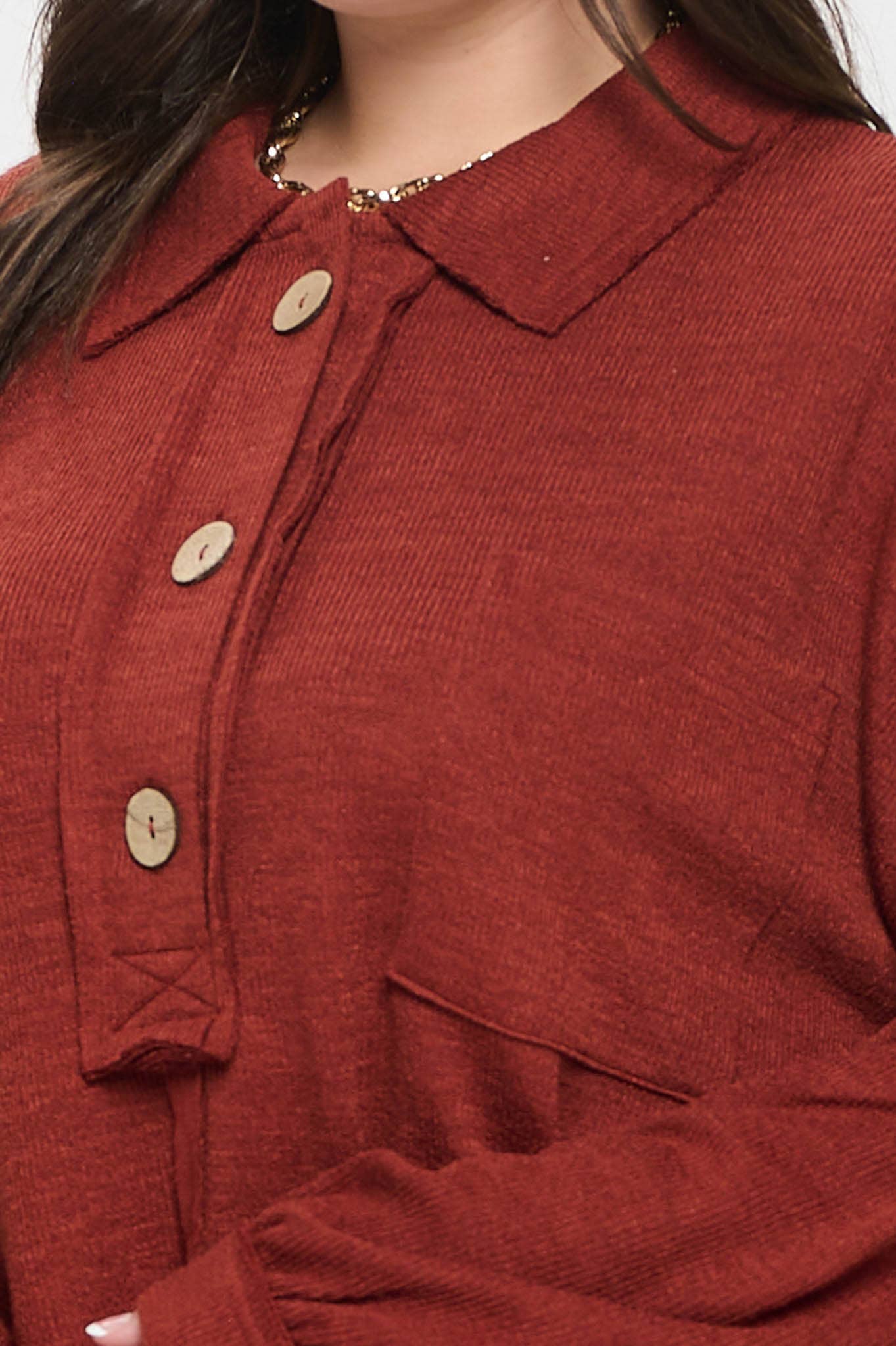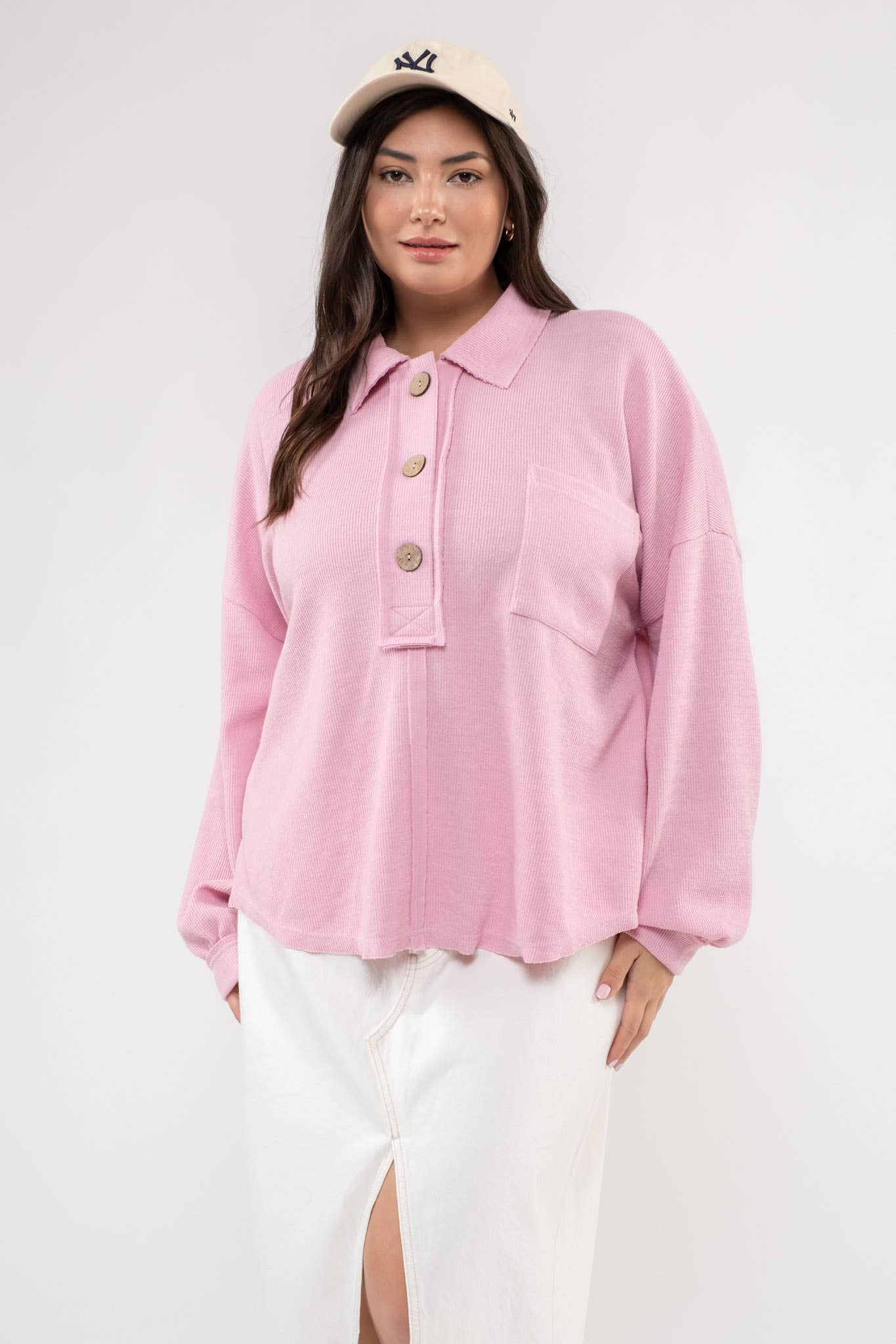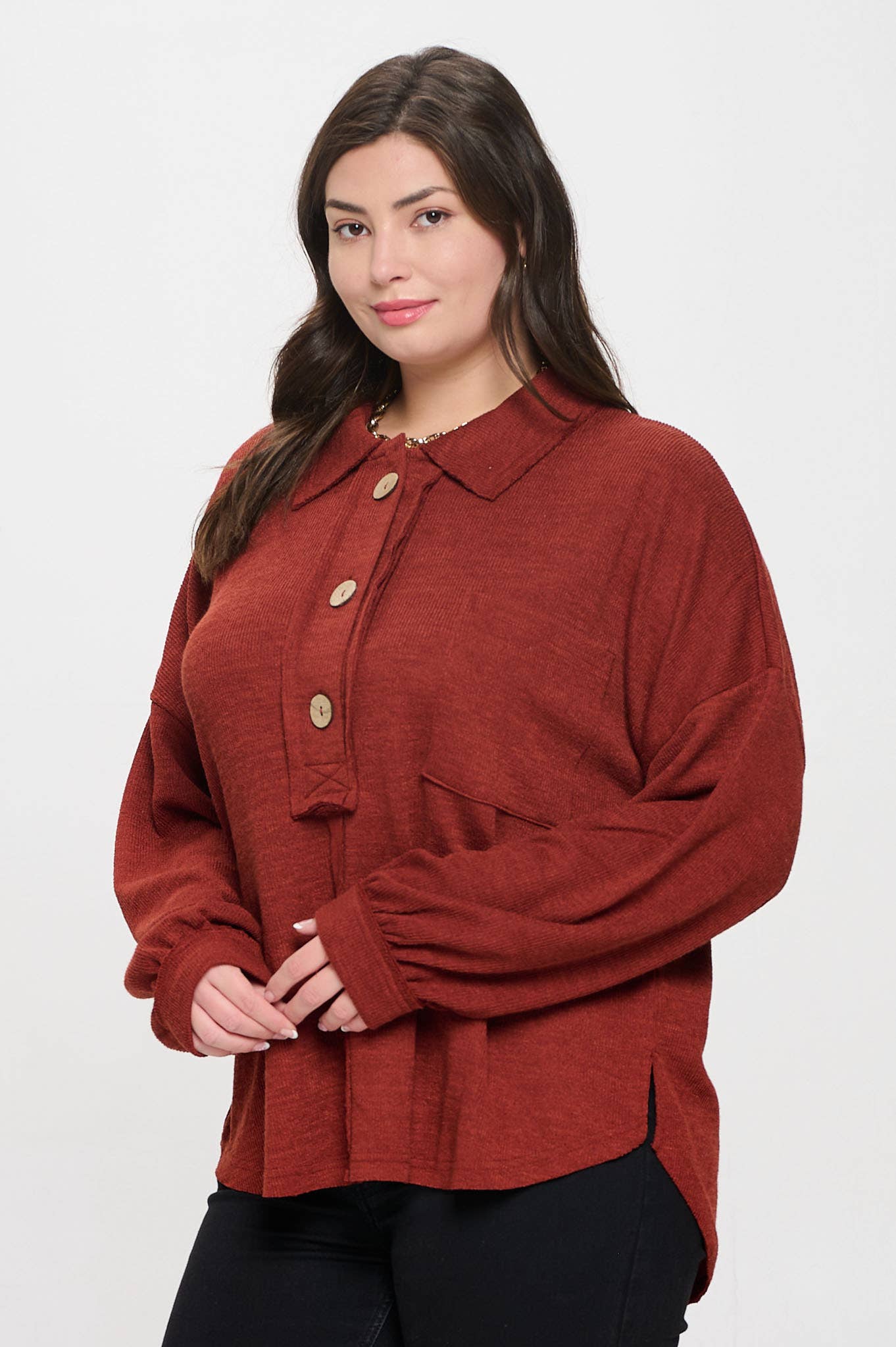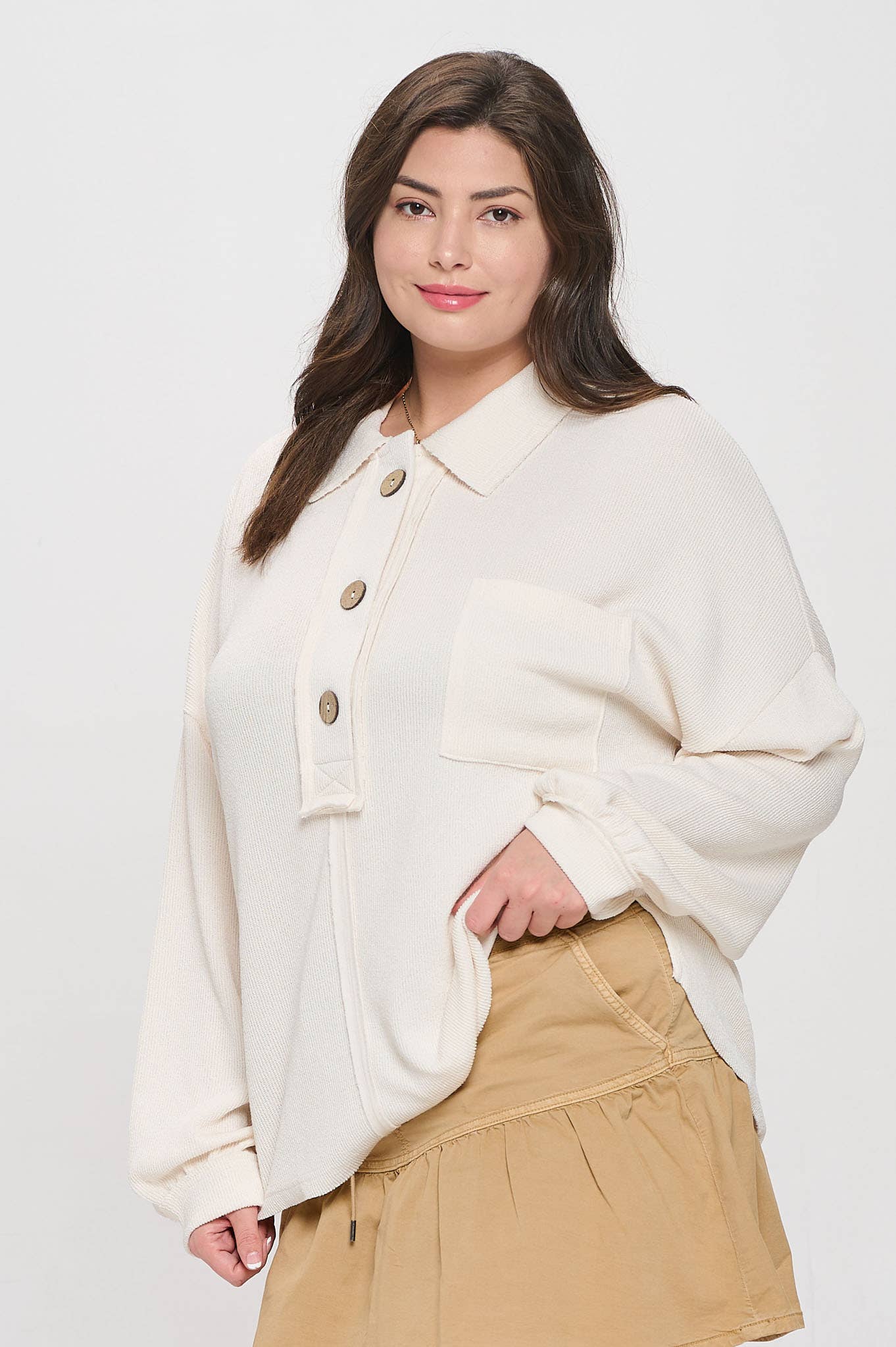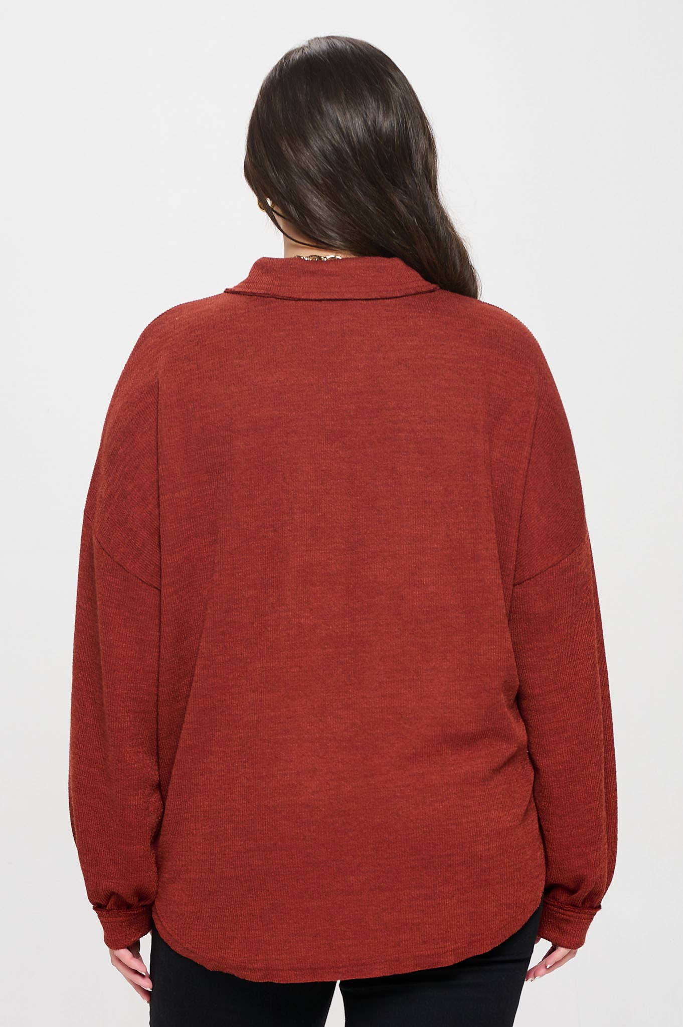 Crafted with a blend of 97% polyester and 3% spandex, this knit top features an extended shoulder, relaxed fit, and raw edge detailing for a modern and stylish look. The collared split neck and chunky button down add a touch of sophistication, while the long sleeves provide coverage and comfort.