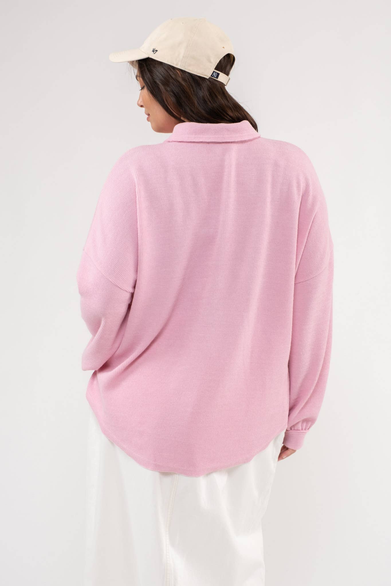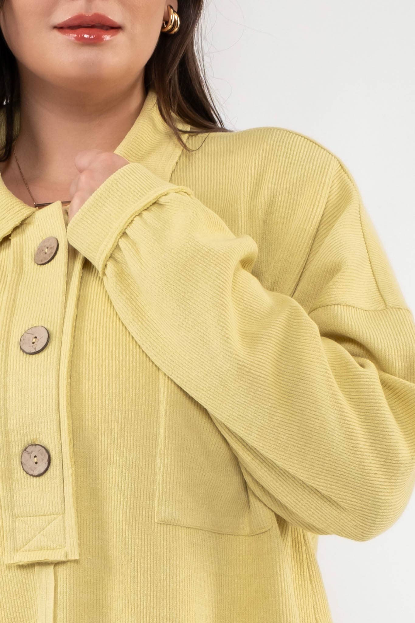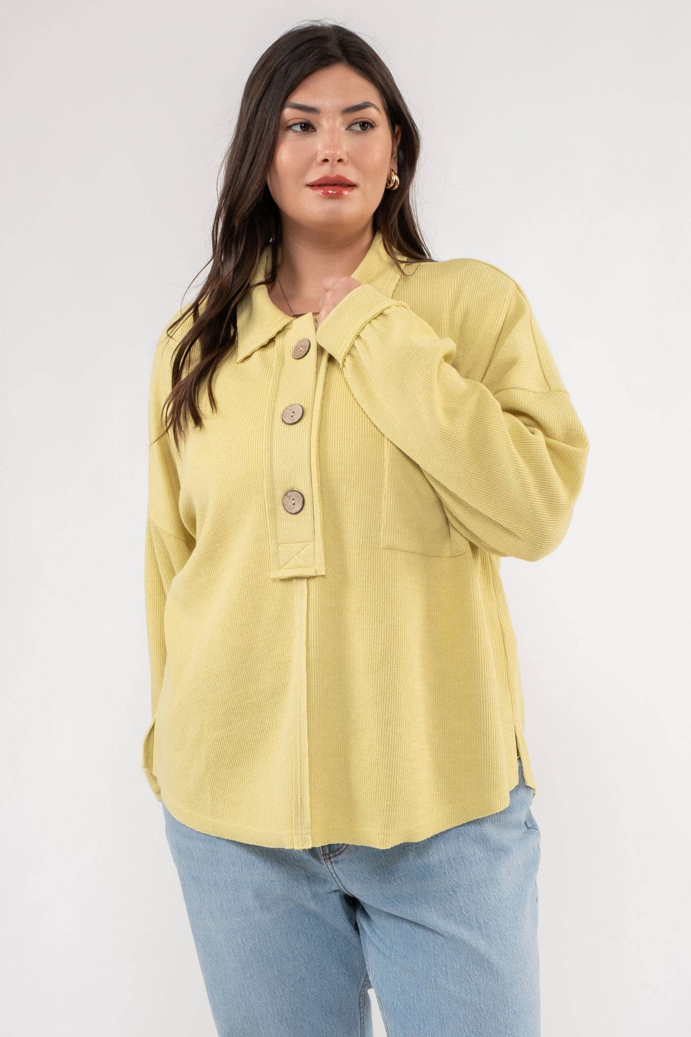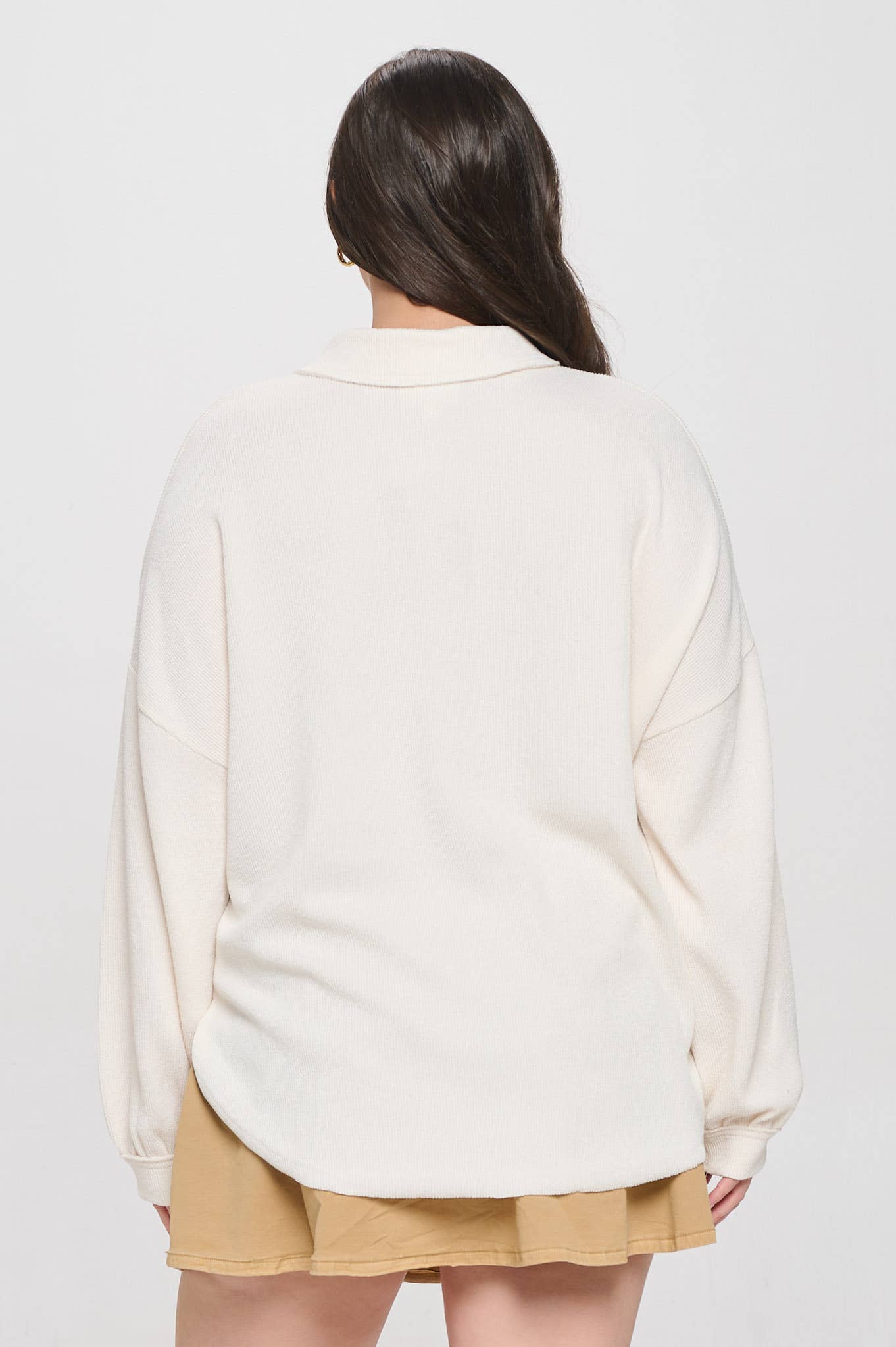 Crafted with a blend of 97% polyester and 3% spandex, this knit top features an extended shoulder, relaxed fit, and raw edge detailing for a modern and stylish look. The collared split neck and chunky button down add a touch of sophistication, while the long sleeves provide coverage and comfort.
