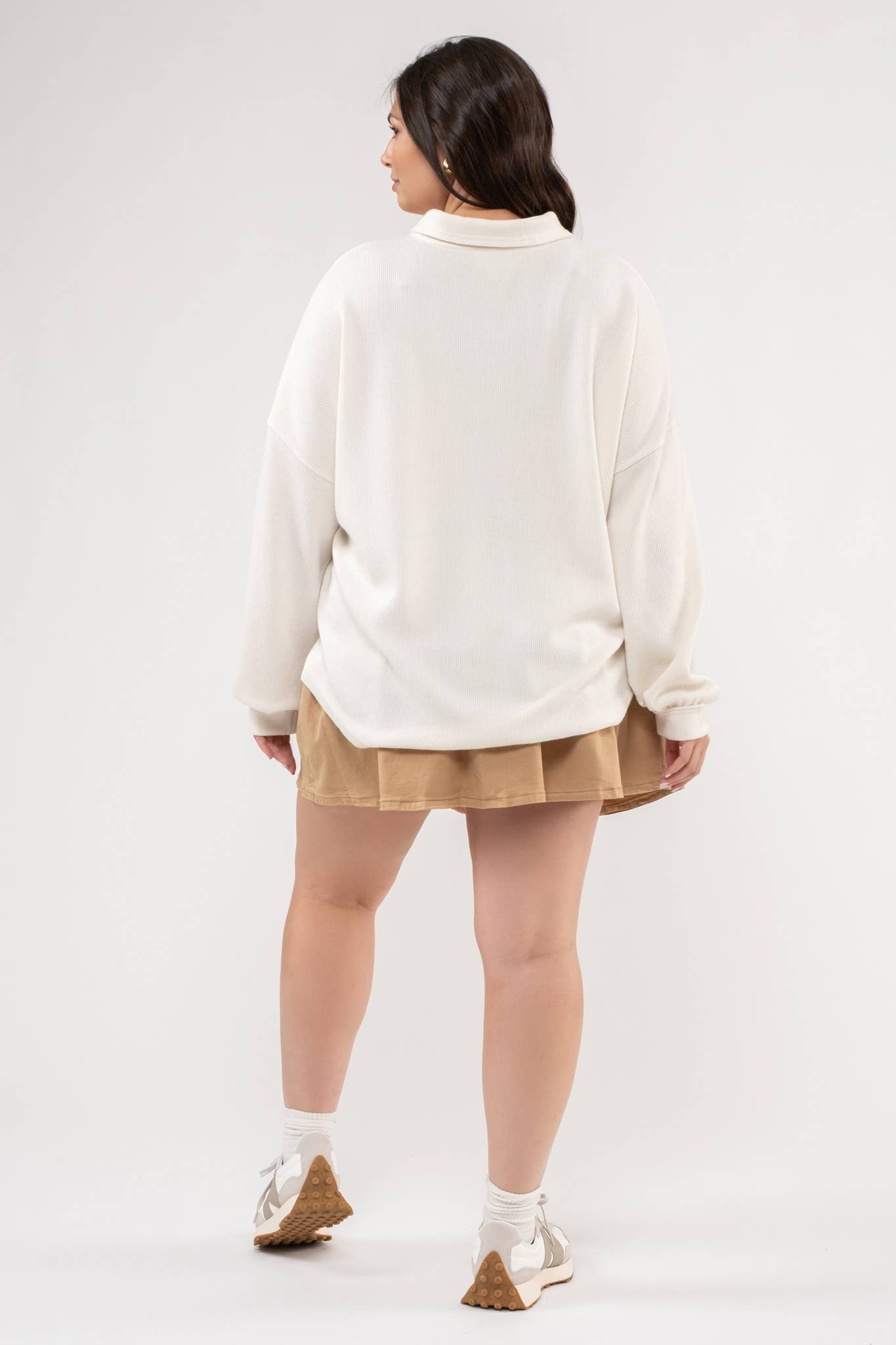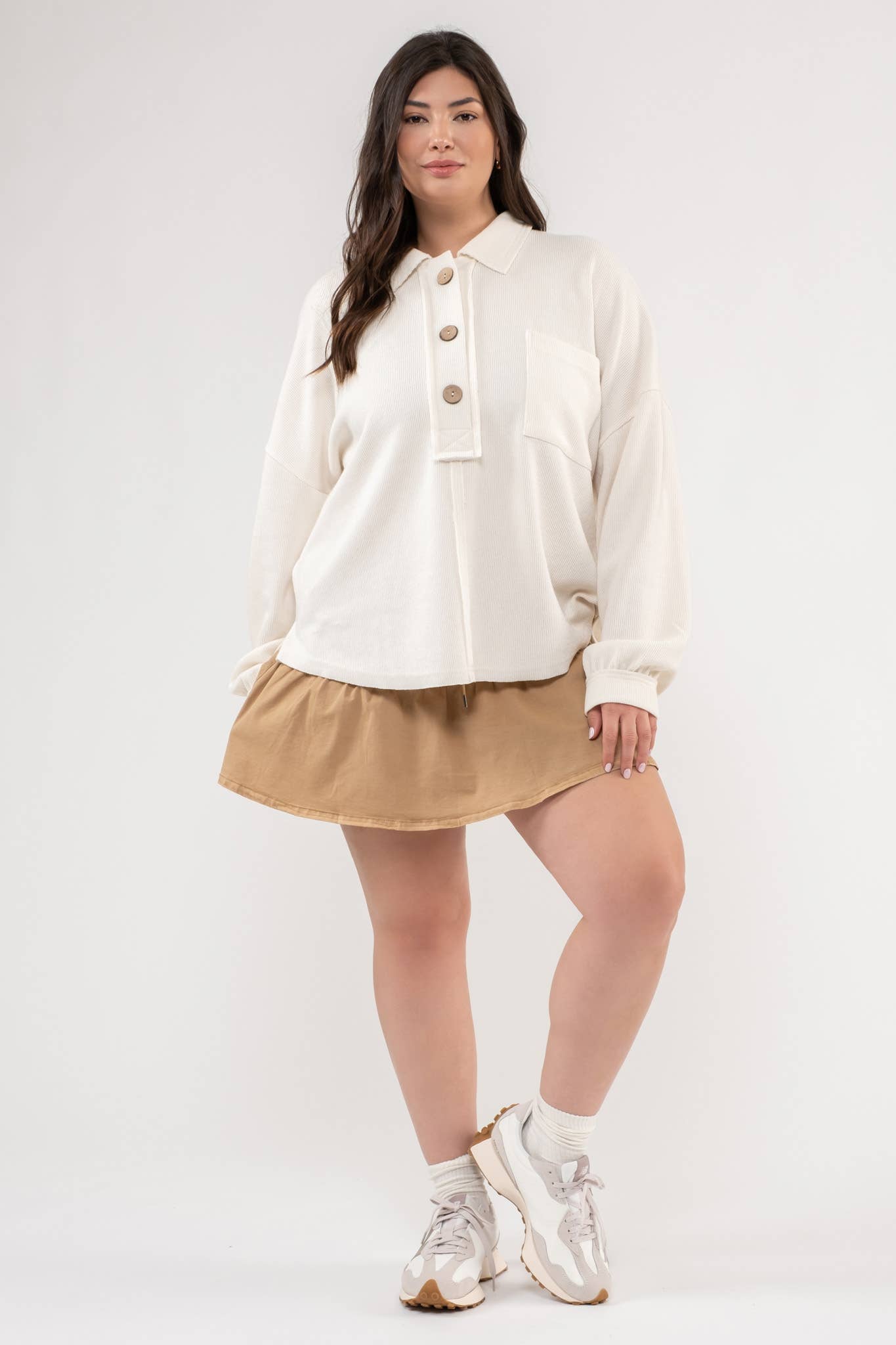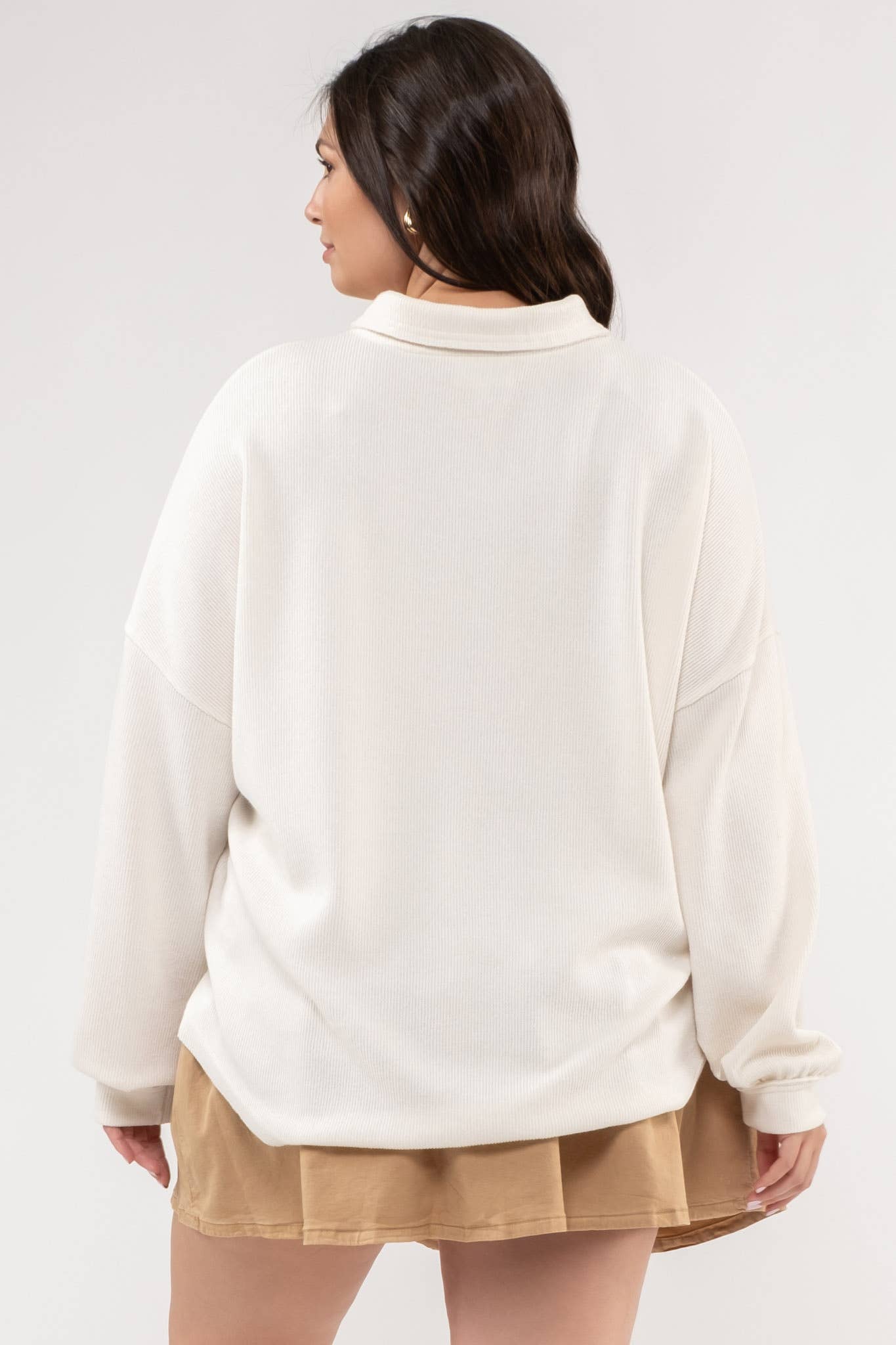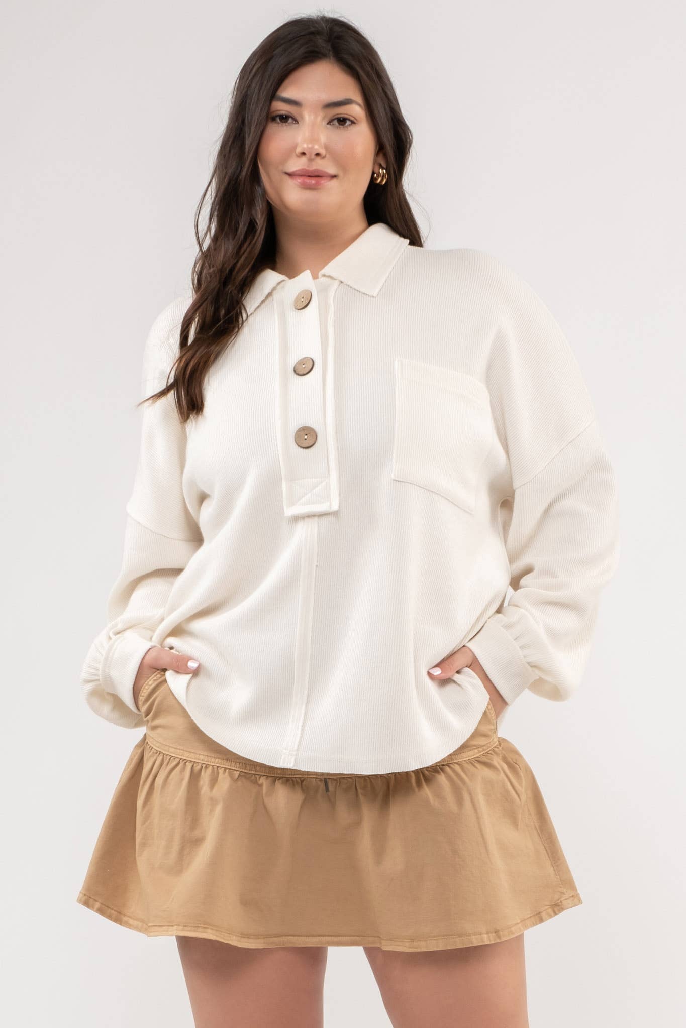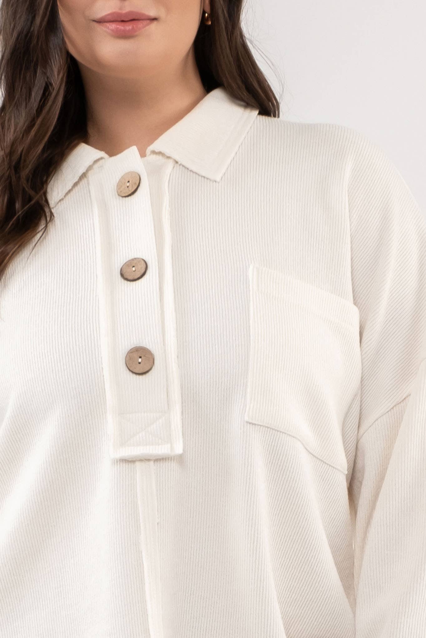 Crafted with a blend of 97% polyester and 3% spandex, this knit top features an extended shoulder, relaxed fit, and raw edge detailing for a modern and stylish look. The collared split neck and chunky button down add a touch of sophistication, while the long sleeves provide coverage and comfort.