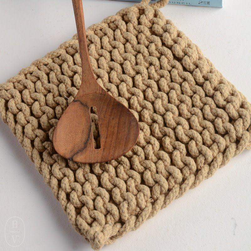 A chunky knit potholder made from 100% cotton protects hands from hot objects. Set one on the table for the perfect teapot trivet. A hanging loop makes for easy storage. Part of the Medley collection of color-coordinated kitchen and table linens from Danica Heirloom.