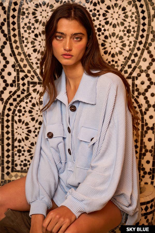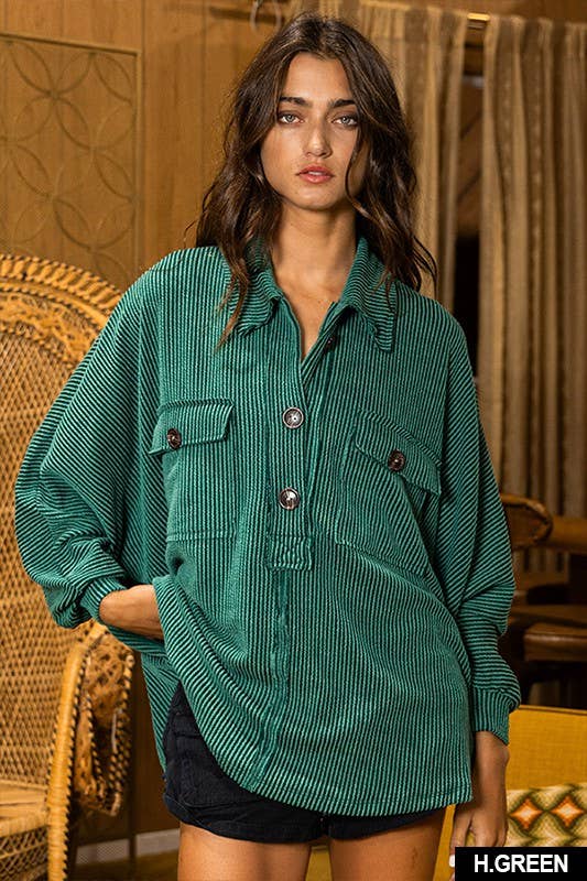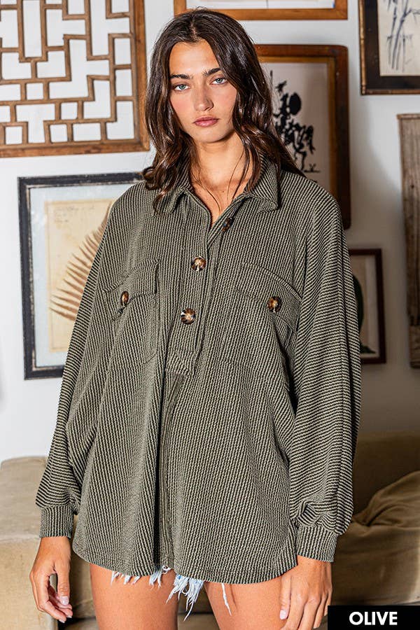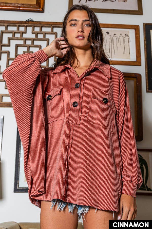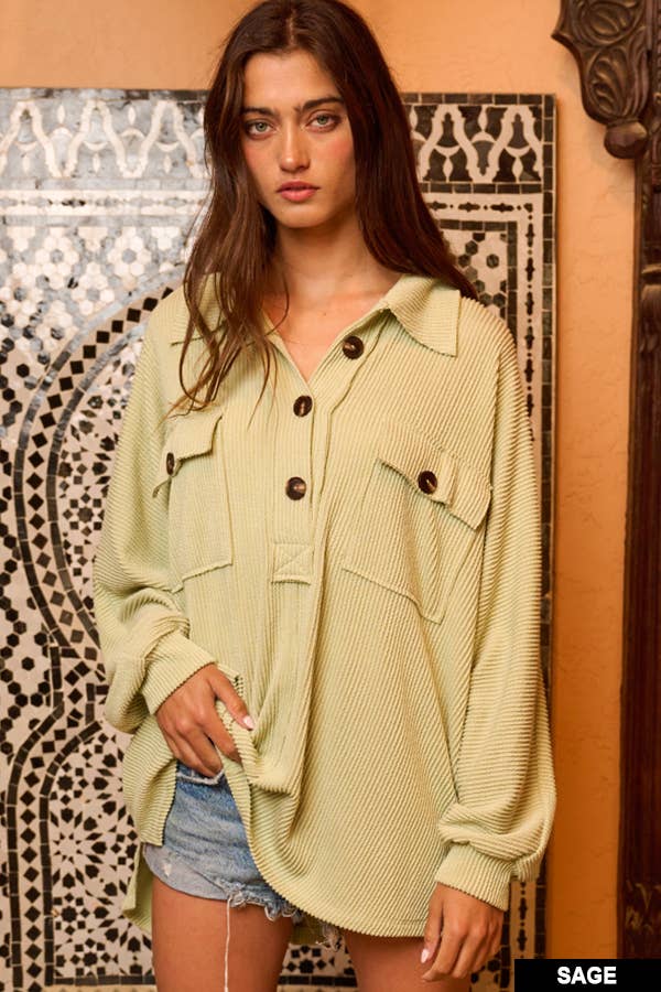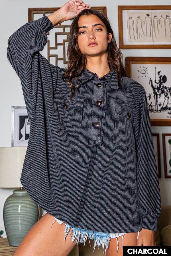 Solid Texture Knit Collared Loose Fit Top