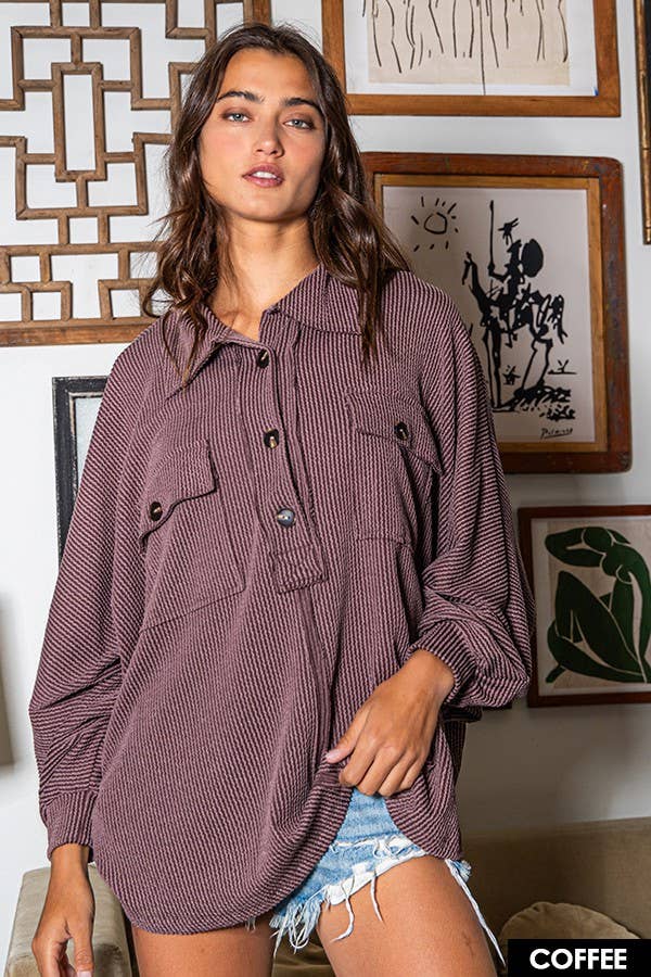French Terry Knit Collared Loose Fit TopBROWN
