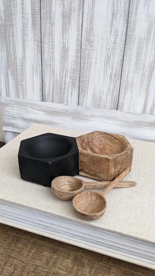 This hexagon-shaped spice bowl stylishly holds salt, pepper, and herbs in two separate compartments. Made of half black and half natural mango wood, it comes with two wooden spoons and measures 6" long by 3.5" wide.